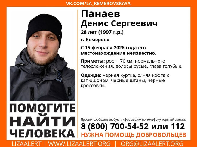 Волонтеры ПСО "ЛизаАлерт" сообщили, что в Кемерове пропал 28-летний Панаев Денис Сергеевич. С 15 февраля 2026 года его местонахождение неизвестно.
