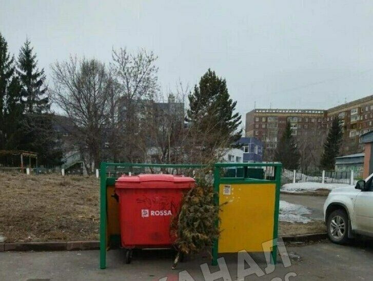 По соцсетям разлетелась курьёзная фотография новогодней ёлки около мусорных контейнеров. Автор фото предполагает, что у кого-то закончилось терпение.