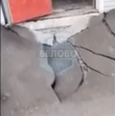 На видео видно, как асфальт у входа в здание полностью провалился и большими фрагментами ушёл вниз, образовав опасный провал прямо на пешеходной зоне.