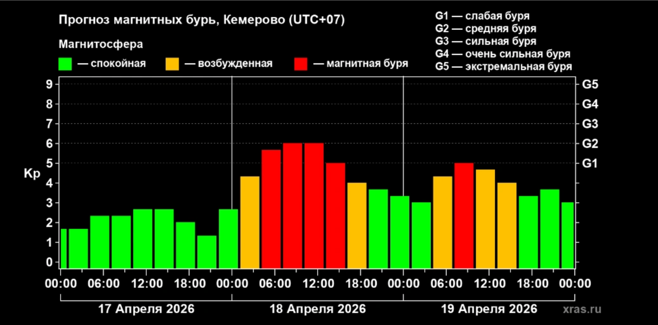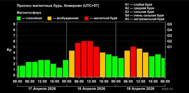 По данным сервиса Time-in, наиболее сильный геомагнитный удар ожидается днём 17 апреля. Именно в это время активность Солнца достигнет пика.