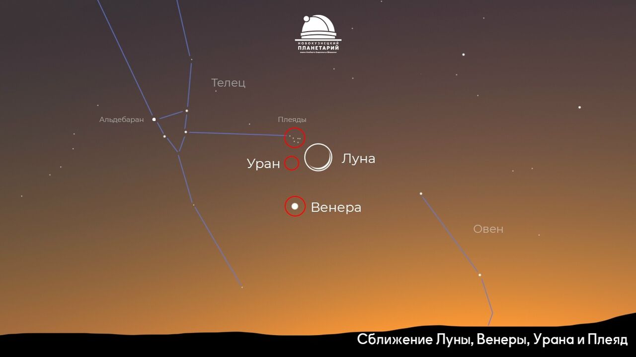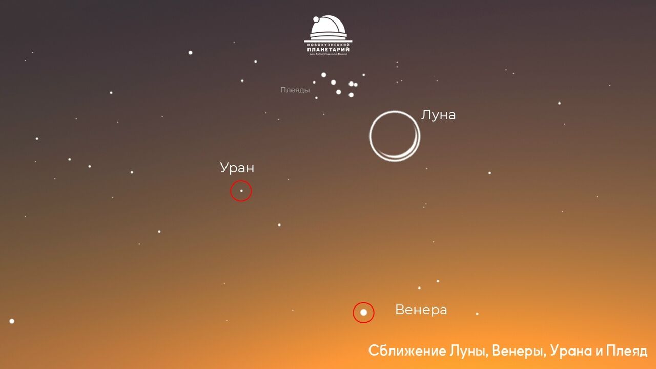 – Тонкий серп Луны будет окружён яркой Вечерней звездой – Венерой, практически невидимым невооружённым взглядом и теряющимся в сумерках Уране и бриллиантами рассеянного звёздного скопления Плеяды, – пишет Новокузнецкий планетарий им. А.А. Фёдорова.