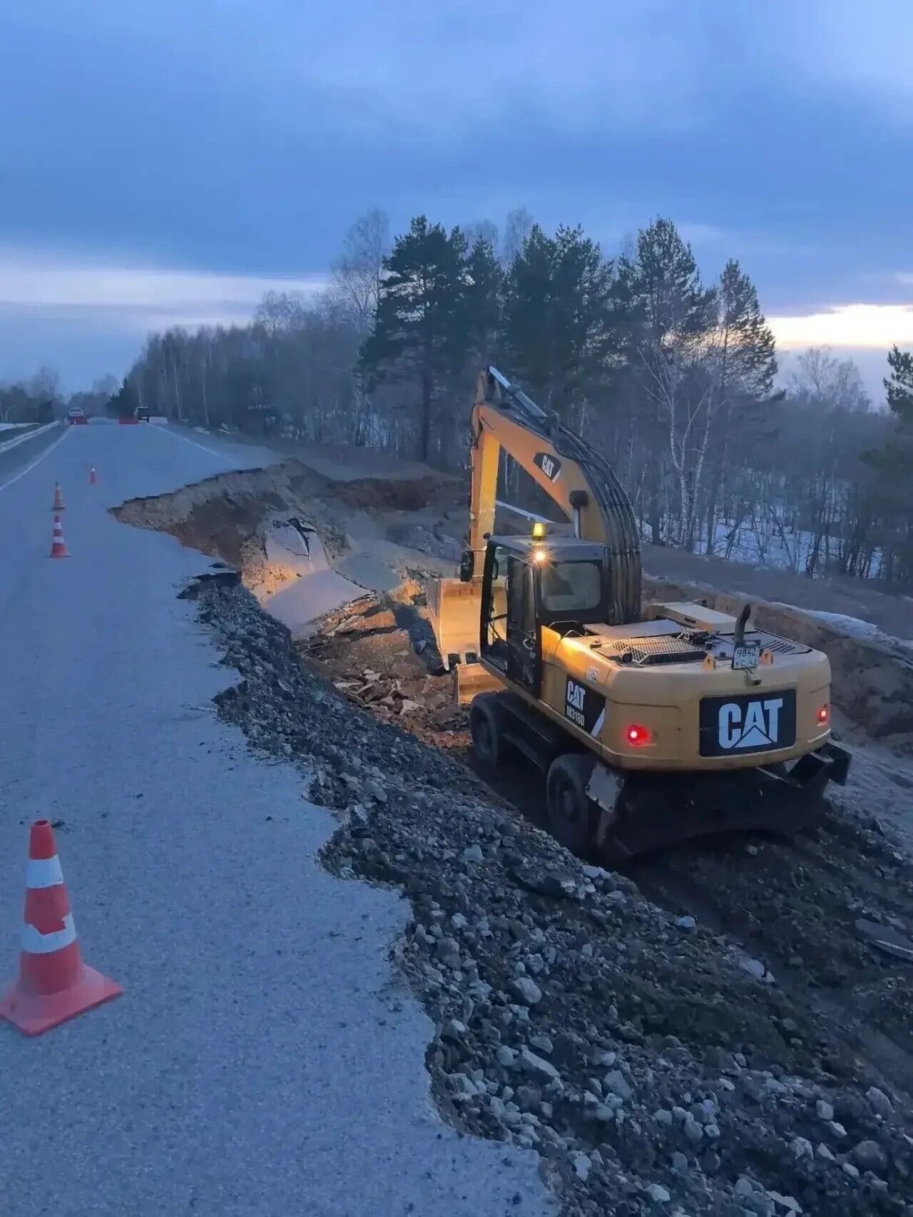 Дирекция автодорог Кузбасса экстренно восстанавливает просевшую трассу в Новокузнецком округе.