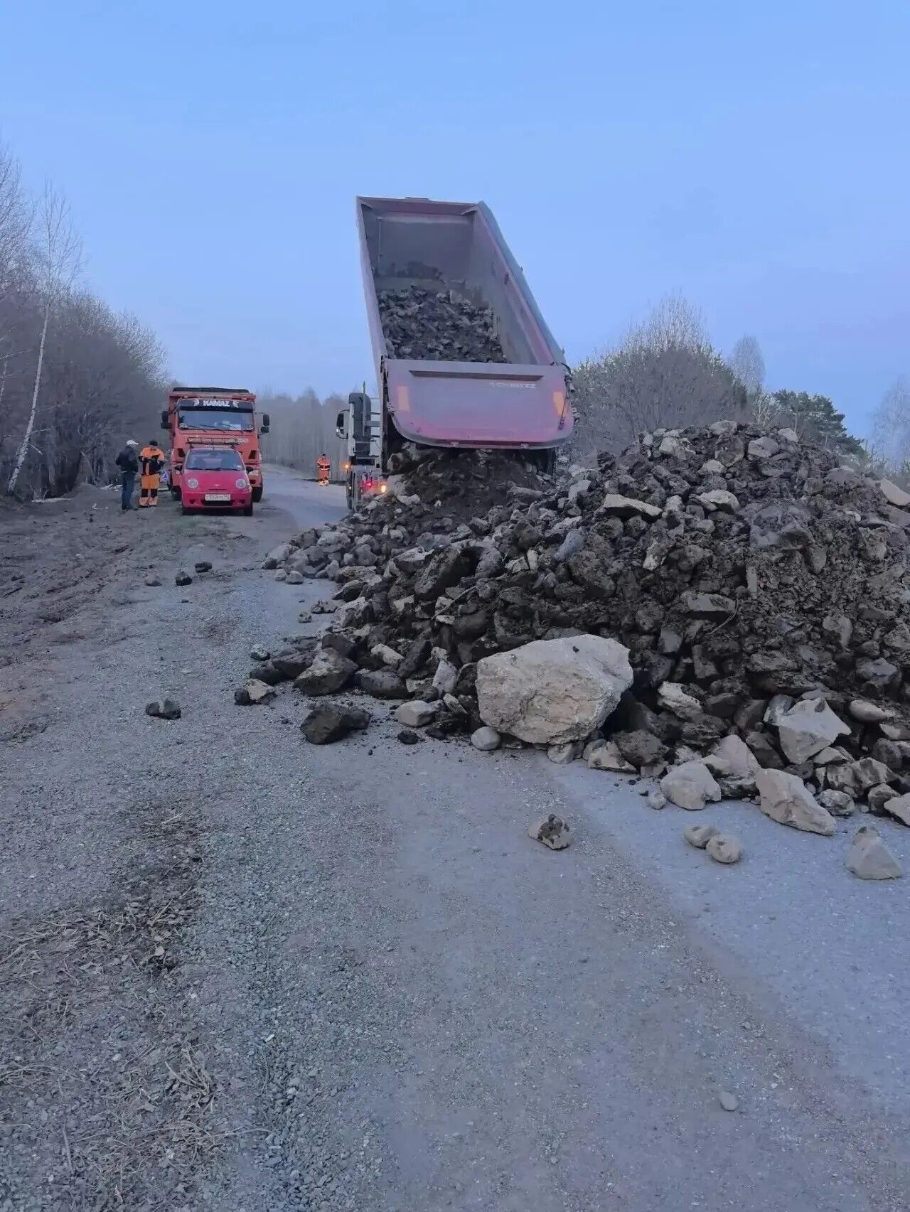 Рабочие корпят над технологическим проездом для легковых машин. Движение там пока закрыто.