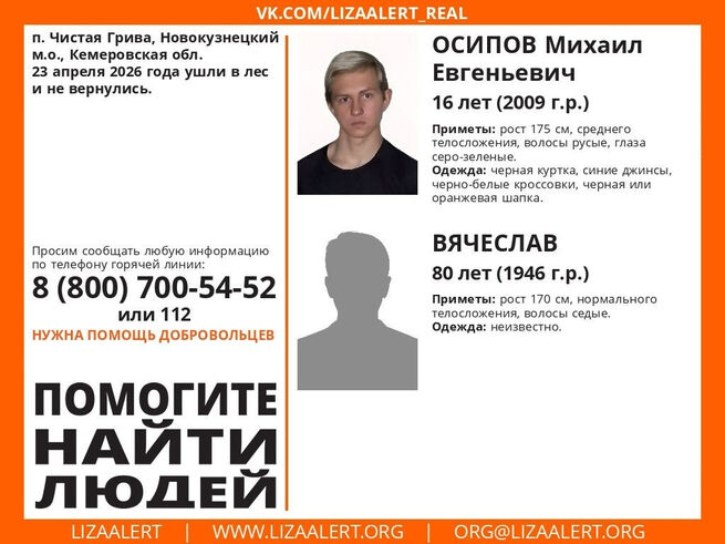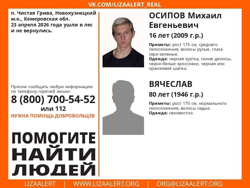 Волонтеры ПСО "ЛизаАлерт" сообщили, что в посёлке Чистая Грива Новокузнецкого муниципального округа пропали 16-летний Осипов Михаил и 80-летний Вячеслав. 23 апреля 2026 года они ушли в лес и не вернулись.