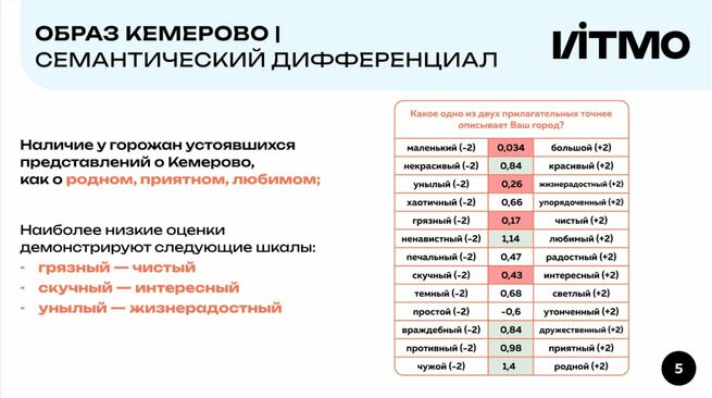 Интересными оказались результаты исследования так называемого семантического дифференциала – метода, при котором жители оценивали город по ряду противоположных характеристик (например, "грязный – чистый") по шкале от – 2 до +2.