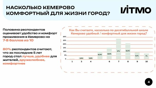 Согласно исследованию, у горожан в целом сформирован позитивный образ Кемерова. Почти половина опрошенных оценивает комфорт проживания на 7–8 баллов из 10, а 80% считают, что за последние годы город стал удобнее и комфортнее.