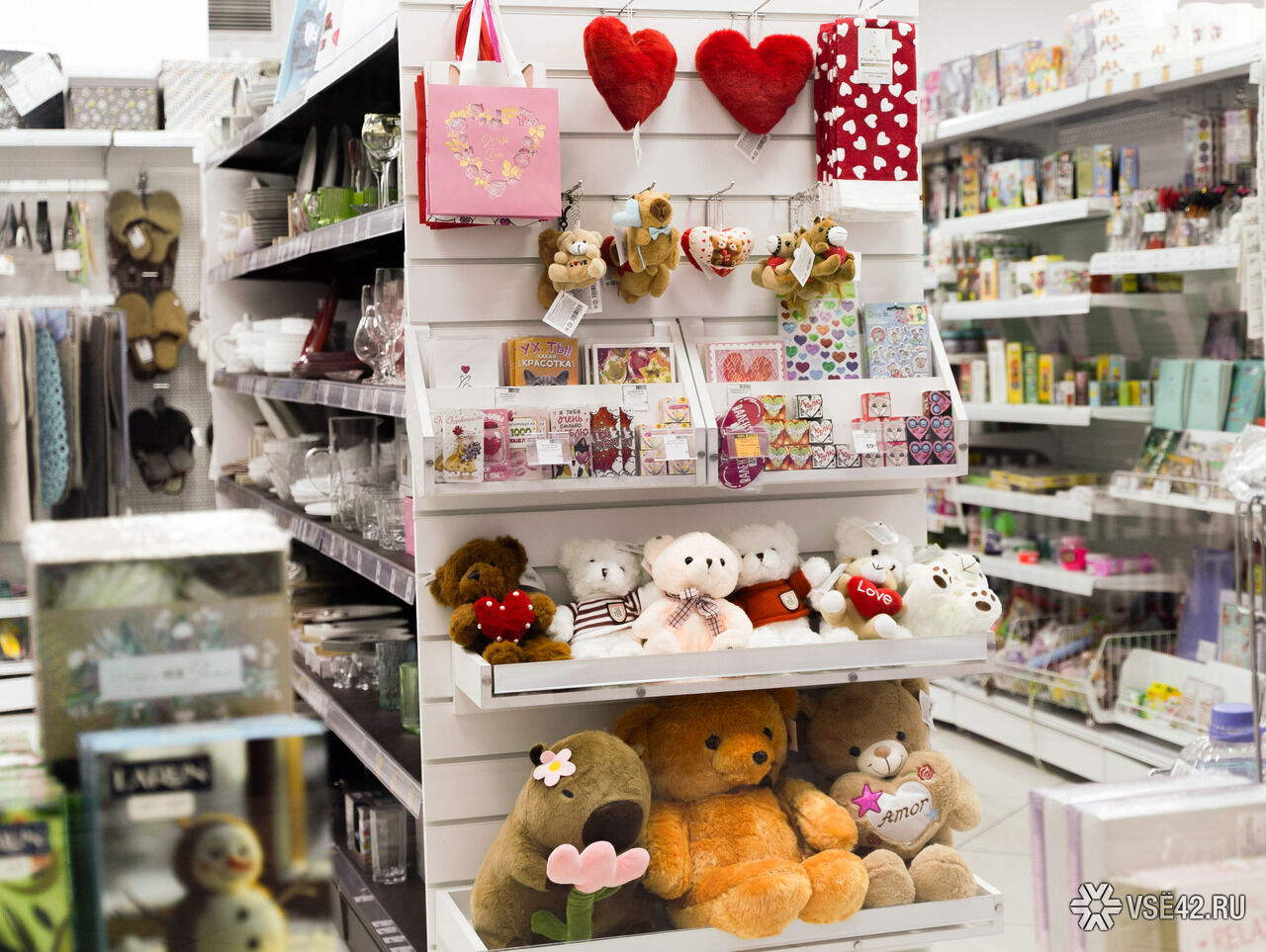 Кемеровские магазины заранее подготовились к "самому романтичному" дню в году и выставили тематические товары на самом виду. Плюшевые игрушки, валентинки, открытки, суверины и вкусняшки. Самые эрудированные соорудили настоящие фотозоны. Например, в стиле "Love Is..." в крупном ТРЦ.